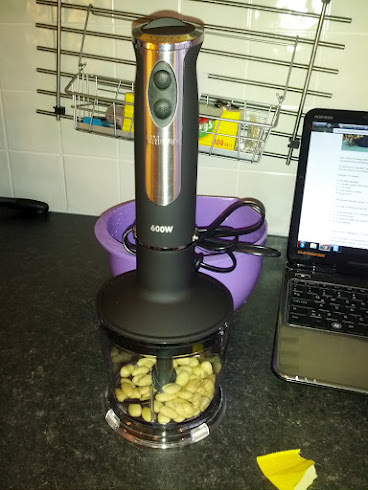 Prófaði nýja töfrasprotann minn við að tæta möndlurnar, ég var síðan enga stund að henda í eina tvöfalda uppskrift, svo fer þetta bara inn í frystir og skorið í 24 bita (ef þetta er tvöföld). Í einfaldri uppskrift eru 1270 hitaeiningar svo að hver biti inniheldur bara 100 hitaeiningar.