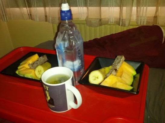 Á seinasta degi sumarfrís eiginmannsins þá ákvað ég að vera góð við hann og gaf honum morgunmat í rúmið. Skar niður melónu og banana, próteinstöng sem ég gerði kvöldið áður og uppáhalds teið hans. Hann var þrusu kátur með þetta, svo kátur að hann sofnaði aftur.