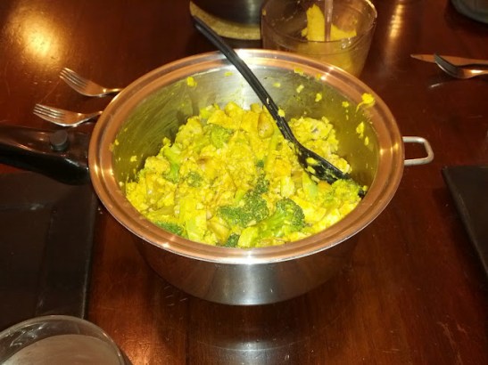 Steiktum 3 kjúklingabringur, suðum 250 brokkolí, 250 gr af hýðishrísgrjónum, og steiktum 250 gr af sveppum. Svo rifum við niður bút af engiferi og 4 rif af hvítlauk og steiktum það upp úr olíu. Svo bættum við við fullt af kryddi eins og salt, pipar, reyktri papriku, cummin, túrmeric og chilli. Svo var hent 1.5 dl af matreiðslurjóma og 1 dl af hreinni jógúrt út í mixið og suðum aðeins niður. Svo var þessu öllu hent saman og hent á borðið og þetta var borðað með bestu lyst.