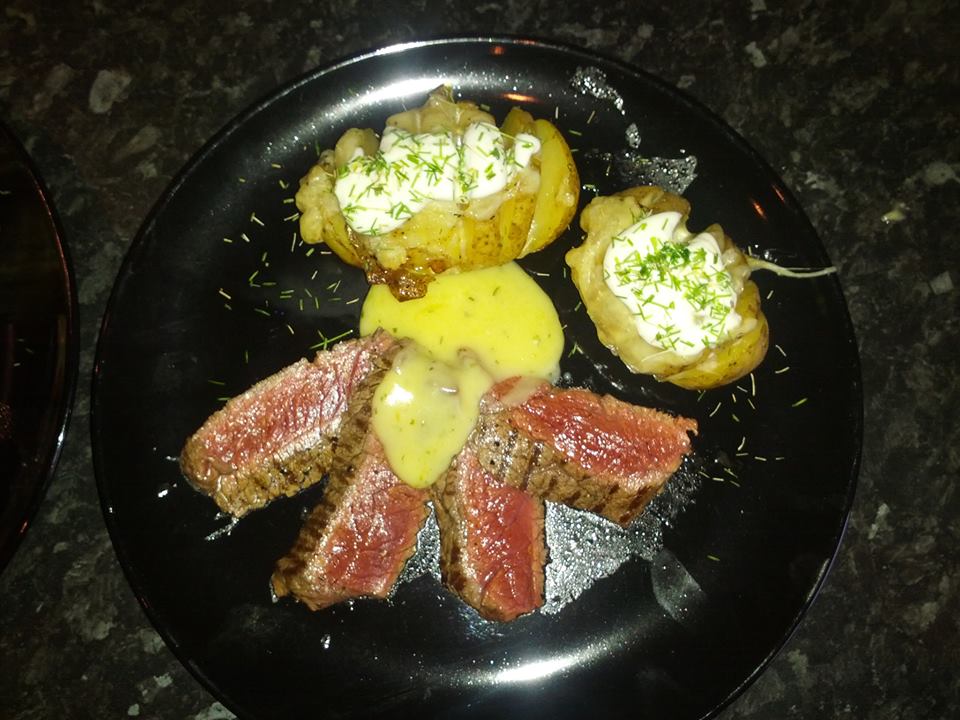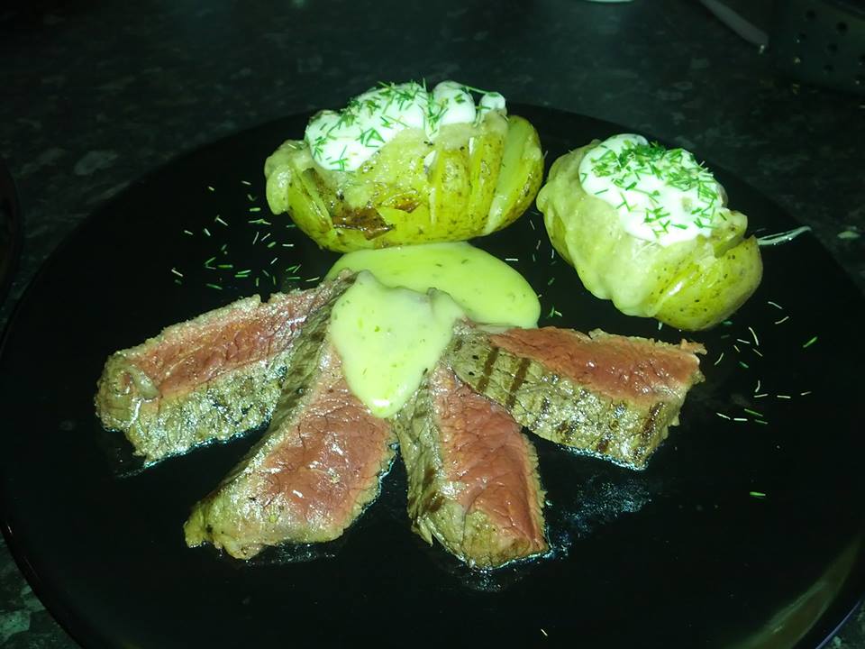 Við þá fukum út í búð með það í huga að kaupa eitthvað extra gott en erum þreytt eftir vikuna svo við vildum ekki að það yrði tímafrekt. Fyrir valinu var nautasteik ásamt hasselback kartöflum og bernaise sósu. Þetta var svo auðvelt og rosalega fljótlegt að ég er fegin að við kíktum ekkert út, ég mundi telja að frá upphafi til enda þá hafi eldamennskan staðið yfir í 30 mínútur. Svo var þetta MUN ódýrara en ef fjölskyldan hefði farið út að borða og hefðum að sjálfsögðu ekki fengið eins fínan mat.